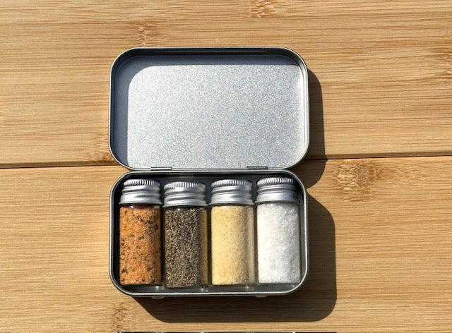 Portable camping spices come in a reusable metal tin with a hinged lid. Includes Ranger band.